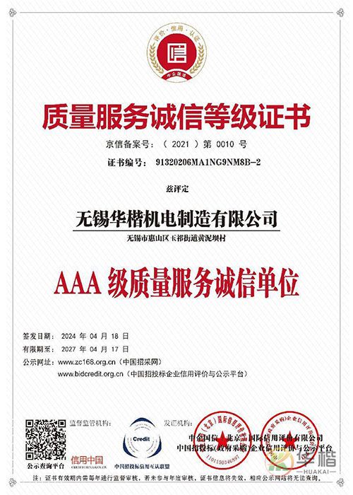 質(zhì)量服務(wù)誠信等級證書